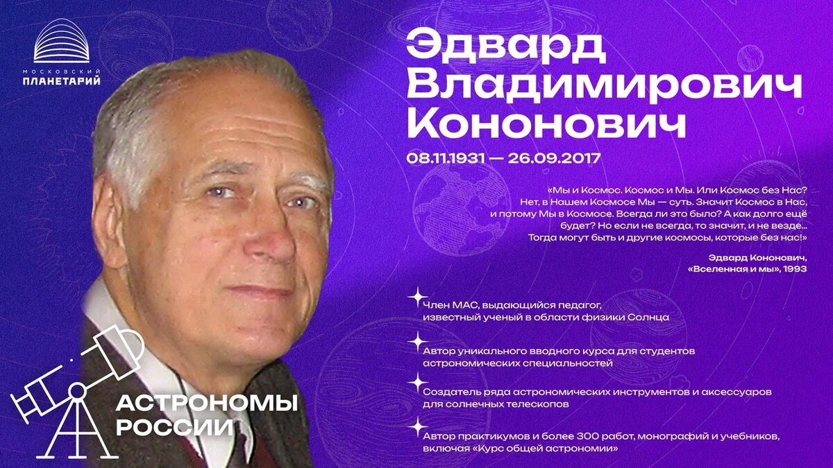 Сегодня мы посвящаем наш рассказ Эдварду Владимировичу Кононовичу — советскому и российскому учёному‑астроному, выдающемуся педагогу и активному популяризатору науки и любительской астрономии, кандидату физико‑математических наук, сотруднику Государственного астрономического института имени П. К. Штернберга (ГАИШ) МГУ им. М.В. Ломоносова. Эдвард Владимирович Кононович внёс значительный вклад в развитие солнечной физики, педагогику и популяризацию астрономии. Его работы и учебники пробудили интерес к астрономии у многих людей и остаются актуальными для современных учёных и студентов.