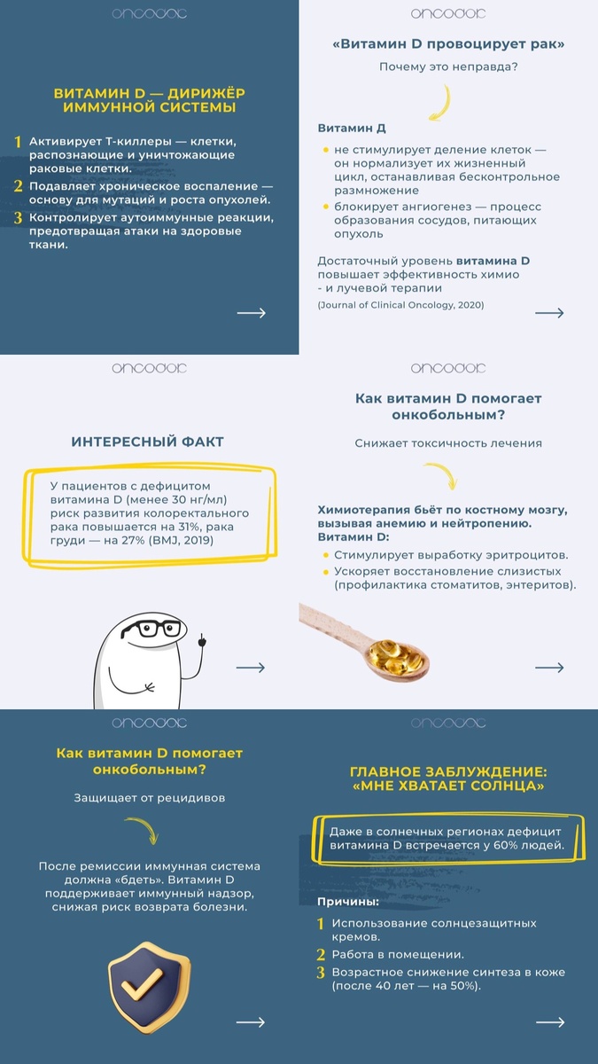 За 7 лет практики я вижу четкую закономерность: часто у пациентов с онкологическим диагнозом есть дефицит витамина D 🔵Врачи в поликлиниках редко назначают анализ на витамин D 🔵Даже при выявленном дефиците назначают слишком низкие дозировки 🔵Не объясняют важность ко-факторов для усвоения (магний, витамин K2) ❗️Рак — это не просто болезнь клеток. Это системный сбой, в котором ключевую роль играет иммунитет. И если раньше витамин D ассоциировался только с крепкими костями, то сегодня наука доказала: он критически важен для защиты от онкологии и поддержки во время лечения. Это не «тренд», а необходимость На карточках выше ➡️ разобрала нюансы по витамину D и почему он так важен при онкологии 🗒️Оптимальный уровень: как контролировать? - Норма: 60-70 нг/мл (для онкопациентов — ближе к верхней границе). - Анализ: Сдавайте 25(OH)D раз в 6 месяцев. Не доверяйте «средним» нормам лабораторий — ориентируйтесь на интегративные стандарты. ‼️Важно! Дозировку подбирает врач: гипервитамин