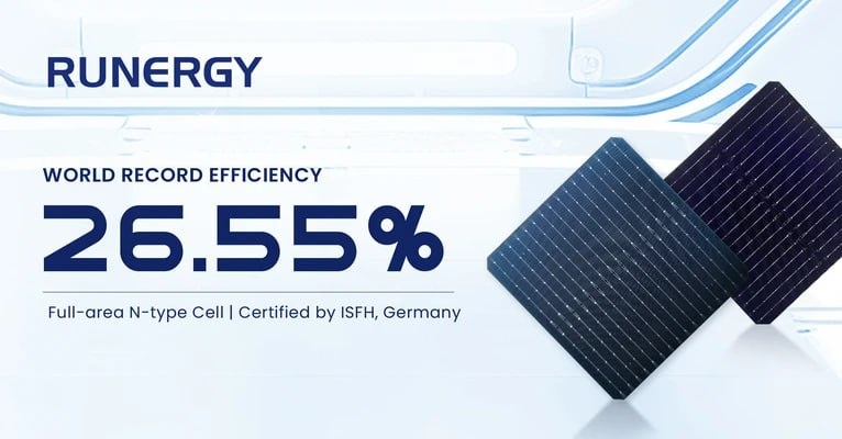 Новый мировой рекорд КПД Пока мы тут отходили от праздников, китайская Runergy представила полноразмерную ячейку TOPCon 3.0 с КПД в 26,55%. Вау! Причём, ячейка эта изготовлена не в лаборатории, а на слегка модернизированной обычной линии, которая теперь является предпроизводственной линией новой технологии. То есть, это улучшение не будет сильно бить по карману производителям. Ну, класс, чё. Лучше же просто добавить немножко денежек в линию, чтоб модернизировать её, чем ломать всё к фигам и строить заново, скажите? Также, директор Runergy доктор Лунчжун Тао сказал, что такого КПД удалось достичь как аппаратным методом, оптимизировав процессы и улучшив пассивацию слоёв, так и программным методом, внедрив систему онлайн-анализа Powerloss, которая в режиме реального времени позволяет количественно оценить потери эффективности по всей технологической цепочке и купировать её ещё на ранних этапах. Короче, ждём, когда новые ячейки формата М10 станут стандартом, а пока что они уже сертифи