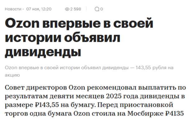 Совет директоров "Озона" рекомендовал выплатить дивиденды по итогам 9 месяцев 2025 года в размере 143,55 рублей на акцию. Если выплата будет одобрена акционерами на Общем собрании, то это будут первые в истории дивиденды от этого маркетплейса (а может и последние, кто ж знает). Выплата, судя по всему, приурочена к редомициляции компании: долгое время на Мосбирже обращались ее депозитарные расписки, а уже на следующей неделе, с 11 ноября появятся акции МКПАО "Озон". Многие другие компании тоже произвели выплату дивидендов после редомициляции, некоторые - впервые в истории. Например, Яндекс, Т-Инвестиции, Хэдхантер, Циан. Что касается Озона, выплата здесь будет связана не только с фактом редомициляции, а и с тем, что эта компания впервые за все время своего существования вышла на прибыльность. Ранее она стабильно работала с убытком, но не потому что у нее все плохо, а потому что вела агрессивную политику расширения, постоянно несла огромные расходы, "съедающие" весь финансовый результат.