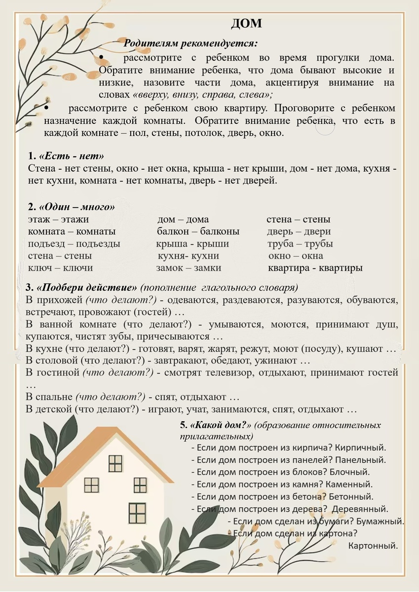 Стена – нет стены, окно - нет окна, крыша - нет крыши, дом - нет дома, Кухня - нет кухни, комната - нет комнаты, дверь - нет двери. В доме много - этажей. В доме много - окон. В доме много - стен. В доме много - лестниц. В доме много - ступенек. В доме много - дверей. В доме много - комнат. В доме много - подъездов. В доме много - полов. В доме много - балконов. В доме много - потолков. В доме много - звонков. Если дом построен из кирпича? Кирпичный.