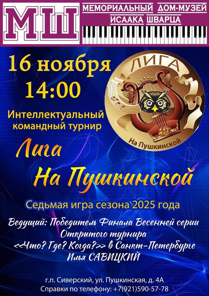 #ДомМузейИсаакаШварца ИНТЕЛЛЕКТУАЛЬНЫЙ ТУРНИР «ЛИГА НА ПУШКИНСКОЙ-2025» Совсем скоро - 16 НОЯБРЯ ! ДРУЗЬЯ! Спешите зарегистрироваться на СЕДЬМУЮ ИГРУ сезона 2025 года. Игра не требует энциклопедических знаний. Основной акцент ответов на вопросы не столько в области эрудиции, сколько в решении логических задач. Если команду сформировать не удалось, не беда - регистрируйтесь одиночным легионером, подберём команду на месте! В команде - НЕ более 7 человек❗ Продолжительность: около 2,5 часов с двумя музыкальными паузами. Ведущий: Победитель Финала Весенней серии Открытого турнира «Что? Где? Когда?» в Санкт-Петербурге Илья САВИЦКИЙ. Игровой взнос: 650 руб./чел. Для зрителей стоимость входного билета: 200 руб./чел. Предварительная запись ОБЯЗАТЕЛЬНА, т.к. количество мест ограничено! Запись по телефону: +7 (921) 590-57-78, в сообщениях группы или в комментариях под постом Хорошее настроение и заряд положительных эмоций гарантированы! Наш канал в Max, вступайте Источник: Открыть