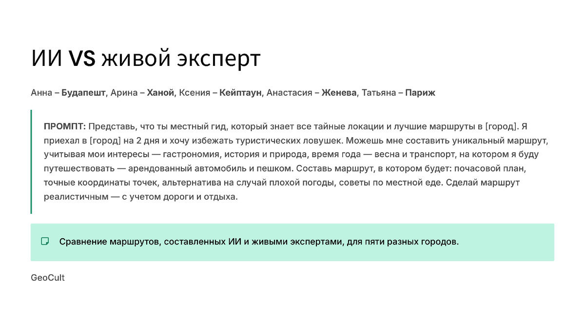 Итак: 5 тревел дизайнеров, 5 городов — Париж, Будапешт, Женева, Кейптаун, Ханой, 5 детальных промптов для ИИ и 5 полученных маршрутов. Начинаем. Но для начала — повторяющиеся комментарии ото всех пяти экспертов.