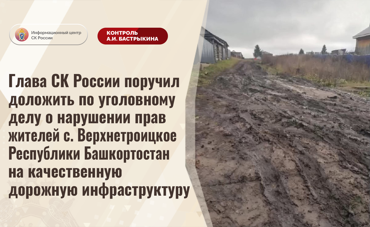 Глава СК России поручил доложить по уголовному делу о нарушении прав жителей с. Верхнетроицкое Республики Башкортостан на качественную дорожную инфраструктуру В комментариях в аккаунте приёмной Председателя СК России А.И. Бастрыкина «ВКонтакте» размещено обращение жителей села Верхнетроицкое Республики Башкортостан по вопросу нарушения их прав на качественную дорожную инфраструктуру. Автомобильная дорога на улице Слободка находится в непригодном состоянии: асфальтовое покрытие отсутствует, грунтовое полотно при выпадении осадков регулярно размывается, на поверхности образовались многочисленные ямы. В результате проезд транспортных средств и пешее передвижение по ней затруднены. Организовано проведение работ только по отсыпке участка, при этом мер к асфальтированию не принято. В региональном следственном управлении возбуждено уголовное дело. Председатель Следственного комитета Российской Федерации Александр Иванович Бастрыкин поручил руководителю СУ СК России по Республике Башкортостан