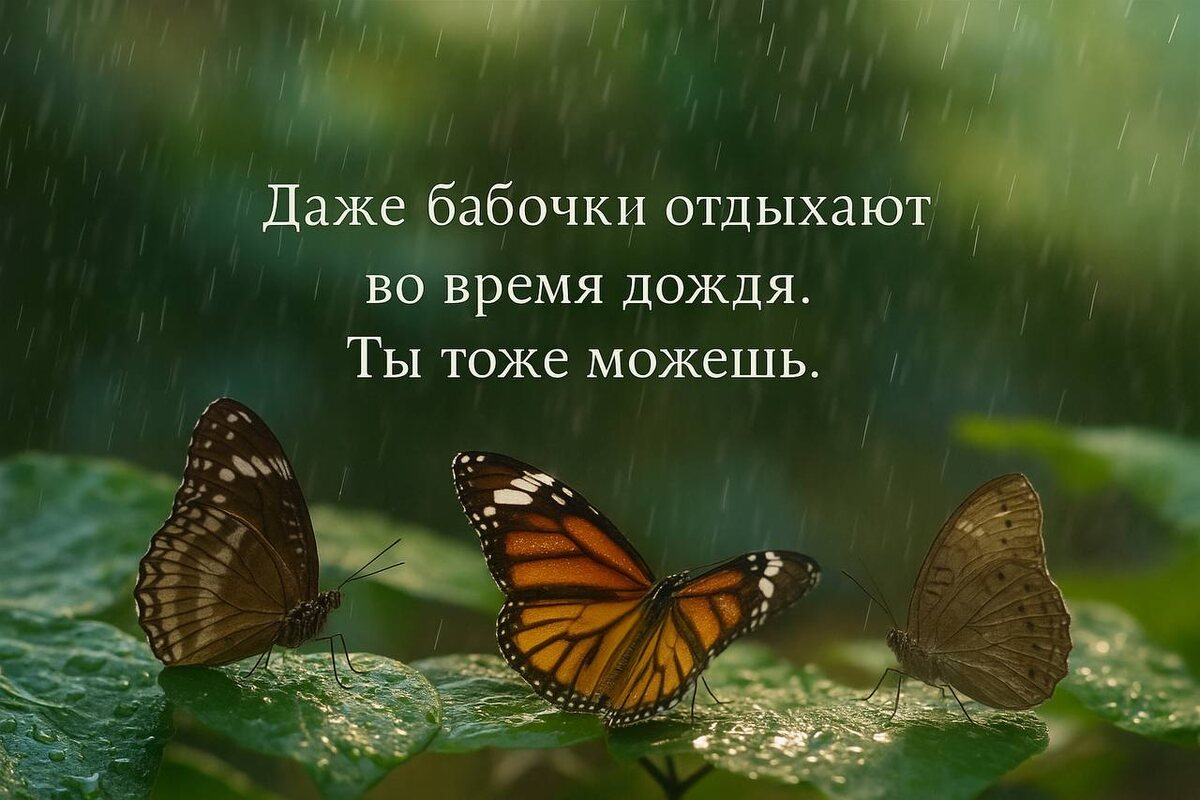 Сегодня я узнала, что бабочки отдыхают во время дождя. Капли слишком тяжёлые — они могут повредить их крылья. И я подумала, как часто мы ругаем себя за то, что не можем «лететь», когда вокруг буря. Но, может быть, в этот момент нам просто нужно укрыться, свернуться в кокон и позволить миру поутихнуть. Отдыхать во время жизненных штормов — это не слабость. Это мудрость природы, которая живёт в нас. И это не про потерять крылья, а про то, что ты их просто бережёшь. И когда дождь пройдёт, ты обязательно снова полетишь 🤍 #осознанность #внутреннийпокой #mindfulness #восстановление #жизненныебури #oxanaradost