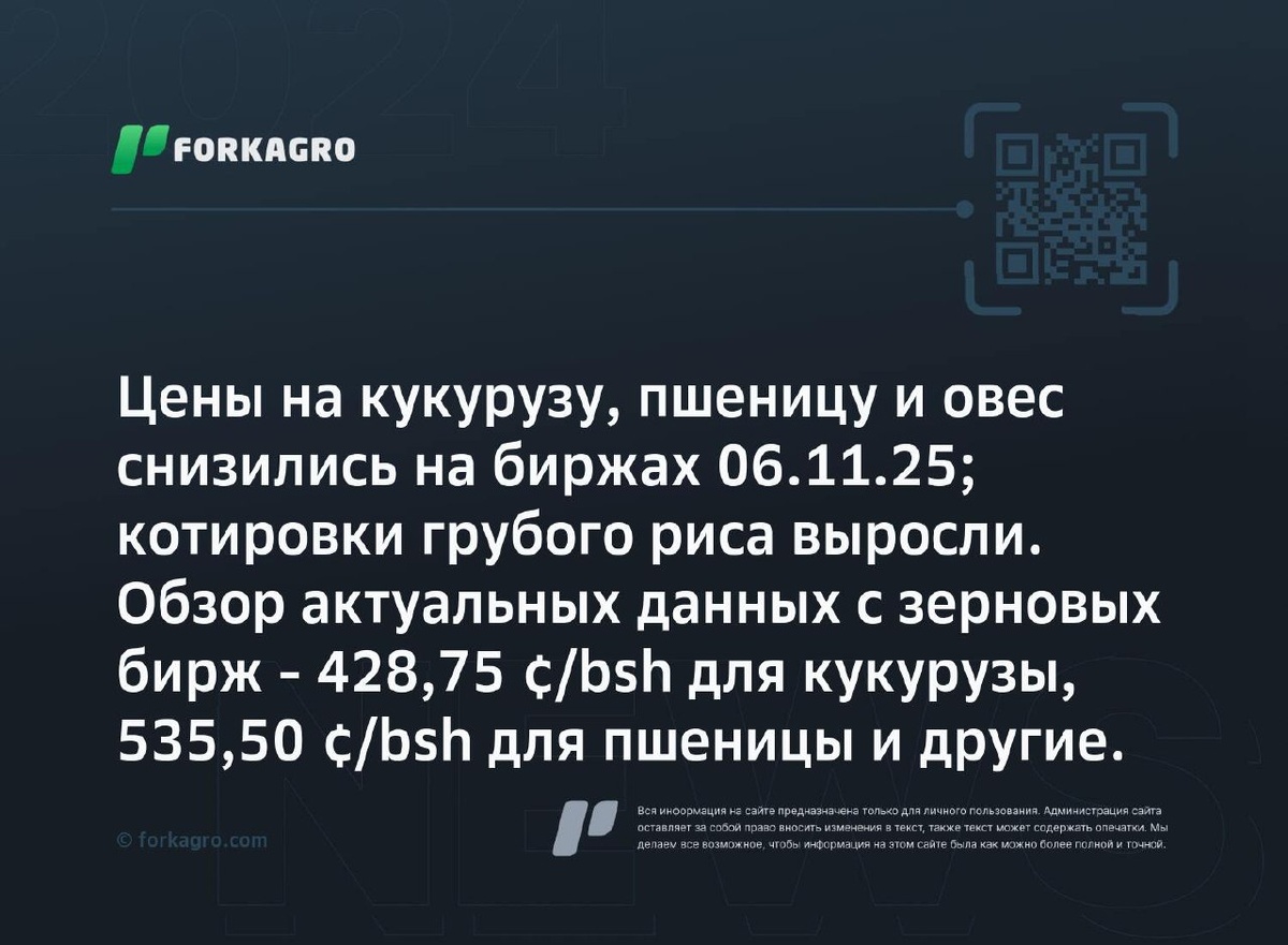 Цены на кукурузу, пшеницу и овес снизились на биржах 06.11.25; котировки грубого риса выросли. Обзор актуальных данных с зерновых бирж - 428,75 ¢/bsh для кукурузы, 535,50 ¢/bsh для пшеницы и другие. На бирже CBOT цены на кукурузу снизились на 6,50 ¢/bsh, достигнув 428,75 ¢/bsh. Цены на мягкую пшеницу сократились на 19,25 ¢/bsh, составив 535,50 ¢/bsh. Котировки твёрдой пшеницы на бирже KCBT упали на 17,75 ¢/bsh, достигнув 522,25 ¢/bsh. Овес подешевел на 6,50 ¢/bsh до 294,50 ¢/bsh, а грубый рис подорожал на 0,07 usd/cwt, достигнув 10,30 usd/cwt. Перейти к источнику