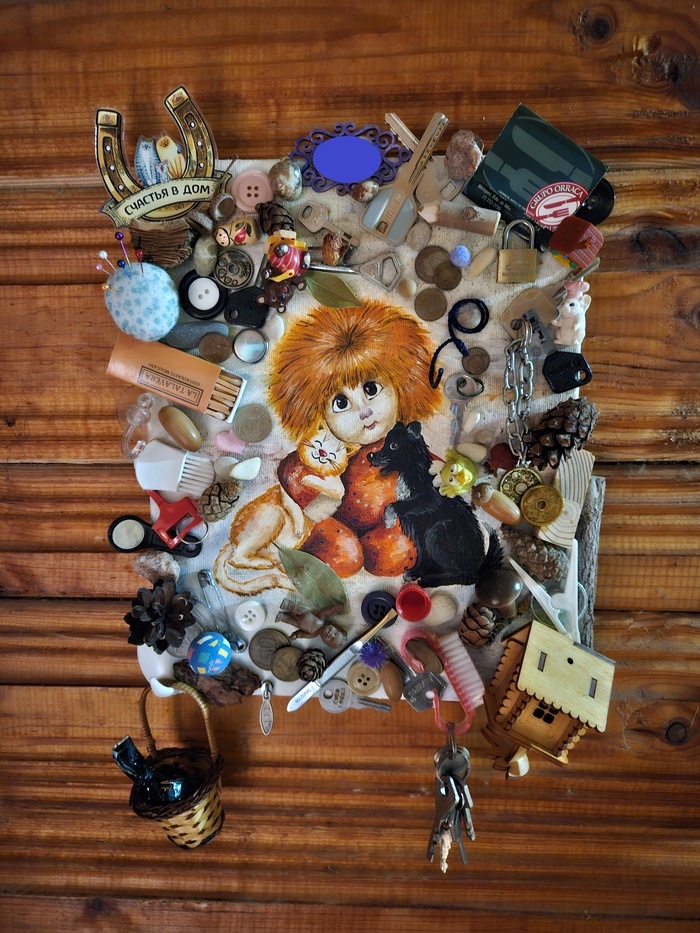 Всех с пятницей, коллеги! Продолжаю экскурсию по нашей избе. Сегодня подбор фоток жилой комнаты и всяких милых нашему сердцу вещей, которые мы успели натаскать или добыть за это время. Начну с главных постоянных жителей нашей избы - домовят. Обоих домовят нарисовала нам в подарок моя мама. Сразу оговорюсь для ценителей прекрасного и тонко чувствующих натур - мама ни разу не художник, нужного образования не имеет и просто рисует для души. Здесь Вашему вниманию представляется Кузенька с котом (куда без кота?) и Басенька. Ну и приданое у Кузи богатое - все, что может пригодиться домовенку в его делах. Висит Кузя в сенях у входа. А это - Ён. Ну, вот такое имя у него. Он - старший из домовят, т.к. появился первым, и отражает то, что творилось в избе на первых порах, когда мы все только разгребали. Он живет непосредственно в избе на полках. Да, это, наверное, не по канону, но что поделать. Помимо домовят в избе имеется красный угол. Для него специально была приобретена икона и старинный, рас
