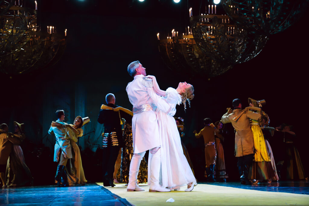 События, описанные Толстым, в постановке Ирины Ткаченко, как мне показалось, происходят осенью, на что намекает орнамент из дубовых листьев на платьях прекрасных дам. Такая маленькая, но достаточно приметная деталь, и выбранные художником Ирэной Ярутис оттенки глубокого черного, искрящегося золотого, акцентного красного, игривого желтого в костюмах и декорациях. Но кажется, что в основе всего — чистый белый. Как лист бумаги, на котором можно писать. Как символ света, который просматривается. Могу лишь предполагать, к чему конкретно ведет отсылка с листвой: к дате рождения Наташи, появившейся на свет, как известно, осенью? или к тому факту, что премьера «Бала» состоялась в ноябре?.. Сценография, цветовая палитра — все отображает характеры персонажей, подсвечивая стилистику нашего восприятия того времени: свисающие светящиеся люстры (художник по свету Евгений Козин), канделябры, размещенные непосредственно на головах артисток шоу-балета, создающие эффект движения времени; выглядящие весьма натурально парики некоторых героев.