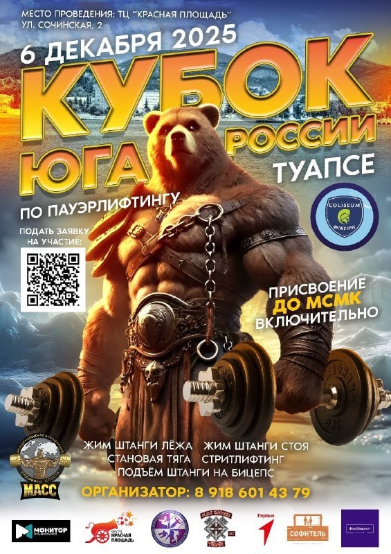 💪 КУБОК ЮГА РОССИИ. Турнир по силовым видам спорта 🗓 6 декабря 2025 ⏰ 12:00 - открытие (10:00-11:50 регистрация) 📍 Место проведения: ТРЦ "Красная Площадь", 2 этаж (г. Туапсе, ул. Сочинская, 2) Это уникальная возможность показать свою силу и мастерство, а также побороться за звание Мастера Спорта Международного Класса (МСМК). 🏋️♂️ Программа турнира включает разнообразные дисциплины: жим штанги лёжа, становая тяга, народный жим, русский жим, военный жим, жим штанги стоя, подъём штанги на бицепс, народная становая тяга, силовое двоеборье, жимовое двоеборье. 🔊 Регистрация участников (14-99+): clck.ru/3QB7gY 🔊 Нормативы: clck.ru/3QB7kF 📞 Справки по тел: +79186014379 - Александр Владимирович @tuapse_afisha #спорт #туапсе #афишаТуапсе #кудасходитьвТуапсе #соревнования #декабрь
