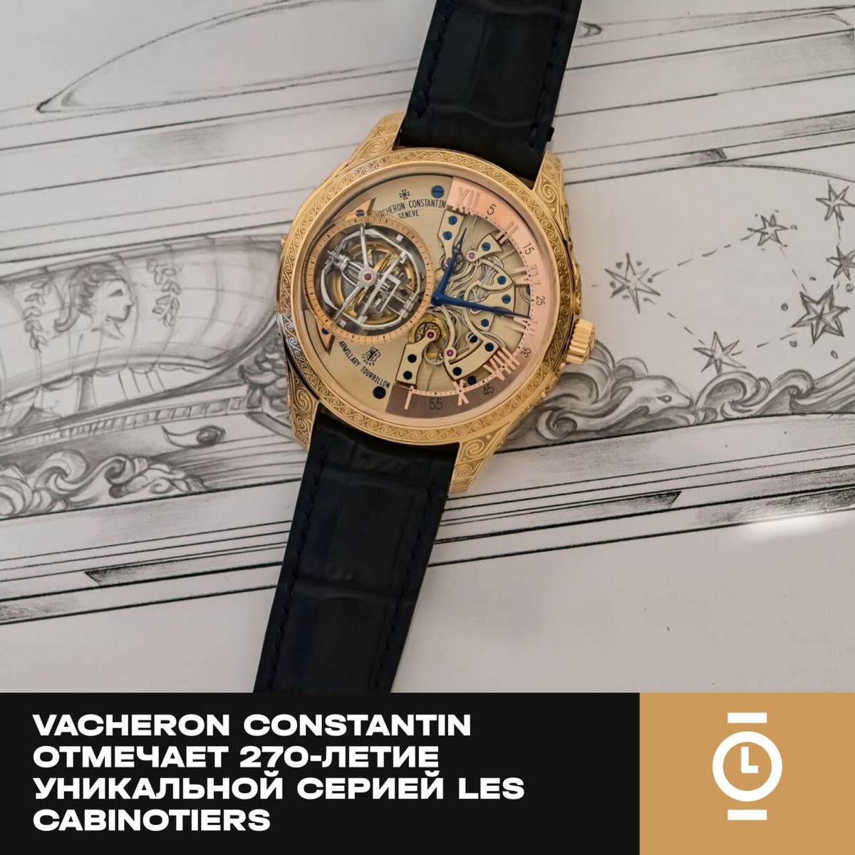 VACHERON CONSTANTIN ОТМЕЧАЕТ 270-ЛЕТИЕ УНИКАЛЬНОЙ СЕРИЕЙ LES CABINOTIERS #новости_WD В честь своего 270-летнего юбилея швейцарский Дом Vacheron Constantin представил уникальные модели коллекции Les Cabinotiers, сочетающие высочайшие часовые усложнения и художественные ремёсла. Каждая из них выполнена в единственном экземпляре и продолжает философию «La Quête» — поисков гармонии между астрономией, искусством и механикой. Первой стала Les Cabinotiers Armillary Tourbillon “Myth of the Pleiades”, посвящённая мифу о Плеядах — семи сестрах, превращённых в звёзды. Корпус из розового золота (45 мм, толщина 20,1 мм) вручную гравирован в технике барельефа по мотивам греческих мифов, на отделку ушло 450 часов. Внутри — калибр 1990 с ручным заводом: 299 компонентов, в т.ч. 45 камней, 60-часовой запас хода. У него две изюминки: двойная ретроградная индикация (часов и минут) и двухосевой армиллярный турбийон. "Армиллярный" значит "состоящий из колец": две алюминиевых клети вложены одна в другую
