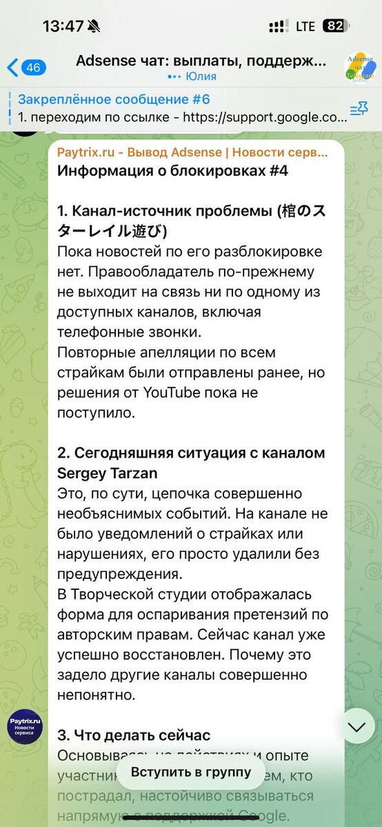 ⚠️ Очередная волна блокировок каналов из-за общего Adsense. В чате коллег снова вынесли адсенс со множеством подключенных к нему каналов, все каналы заблокированы. По данным на текущий момент: 1️⃣ Канал-источник проблемы остаётся заблокирован, правообладатель не выходит на связь даже по официальным каналам. Пока его не разблокируют, ни один канал не разблокируют, кто попал в эту историю. 2️⃣ Канал был удалён без предупреждений и уведомлений — просто исчез..и отлетели следом все каналы с адсенса. 📌 Такие случаи показывают, насколько важно подключать канал только к ИНДИВИДУАЛЬНОМУ АККАУНТУ АДСЕНС, который открываете вы сами или открывают для вас (не покупают!). Иначе вопрос потери вашего канала или потеря монетизации - лишь вопрос времени. 🎯Только в приведенном в пример чате это уже далеко не первая блокировка. Мыши кололись, но продолжали курить кактус.. 📬 Для тех, кто хочет защитить свои доходы и подключить надёжную монетизацию — всё можно сделать через нашего официального бота