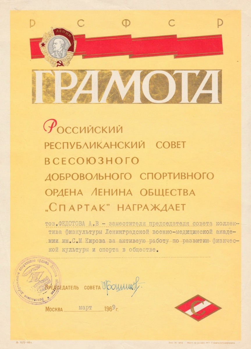 Российский республиканский совет всесоюзного добровольного спортивного общества Ленина "Спартак" награждает товарища Федотова А.В. - заместителя председателя совета коллектива физкультуры Ленинградской Военно-медицинской академии им. С.М. Кирова за активную работу по развитию физической культуры и спорта в обществе. Источник: отсканированная грамота из личной коллекции. #документ #грамота #ВМедА #Ленинград #спорт #военное_образование