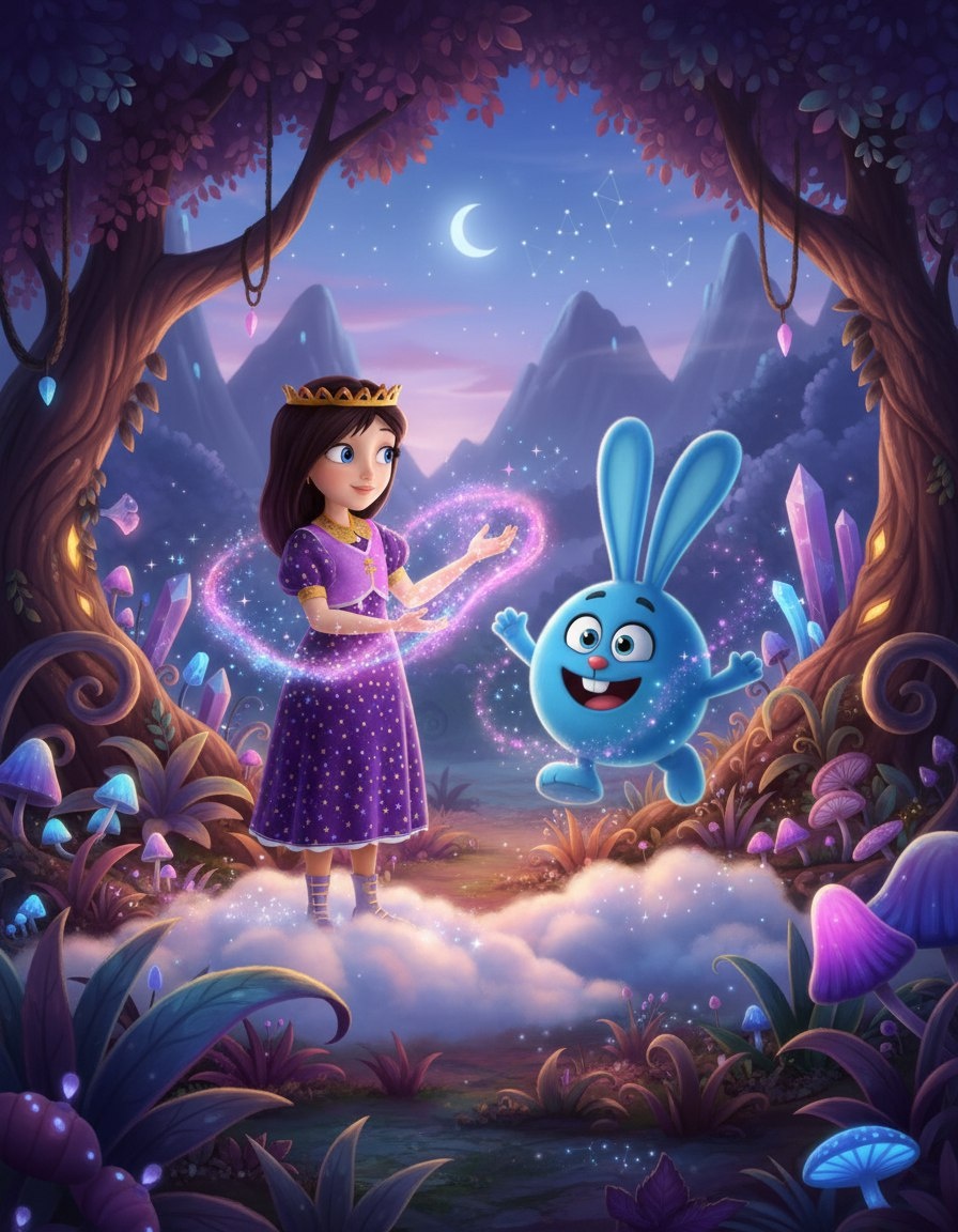 «Сонный сон Сони и бодрый Крош» В тихий вечер Соня решила прилечь на минутку в саду у дворца — просто отдохнуть. Но стоило ей закрыть глаза, как рядом раздалось стремительное: — Пр-и-вет! П-привет! Привет!! Соня вздрогнула, открыла глаза — и увидела перед собой голубого кролика, который прыгал вокруг неё, словно пружинка. — Ой… ты кто?.. — сонно протянула она, моргая длинными ресницами. — Я Крош! — гордо заявил кролик. — Хо-о-очешь, покажу супер-прыжок? Или можем построить что-нибудь! Или пробежаться! Или вот — морковка! Соня немного улыбнулась. — А можно… чуть тише? Я просто прилегла ненадолго… Крош замер, наклонил голову: — Поспать? Эээ… ну… я попробую… Он шагнул ближе, присел рядом и старательно попытался не прыгать. Получалось плохо: его лапы подрагивали, уши дергались, а глаза сияли энергией. Соня тихонько хихикнула и взмахнула рукой: — Ладно… хочешь, я покажу тебе сон? Над ними вспыхнула мягкая золотистая дымка, и на траве появилось волшебное облачко — маленькая площадк