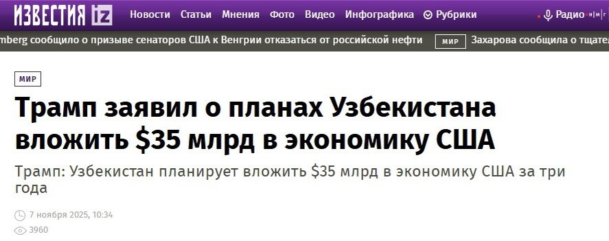 Коротко по встрече Трампа с лидерами стран средней азии. 1. Очевидно бросается в глаза заискивание на гране идолопоклонничества "стратегических союзников" России перед нашим стратегическим противником. Тот же Токаев перед СМИ обращается к Трампу на английском, а вот после встречи с Владимиром Путиным, так же под камеру, говорит на казахском, хотя объективно русский он знает много лучше английского. Но тут дело в демонстрации отношения, а не удобстве. 2. Узбекистан намерен стать инвестором в США. В перспективе заявленные 35 млрд долл. США могут увеличиться аж до 100 млрд. Стесняюсь спросить, а откуда у одной из беднейших стран столько денег? Не от паразитирования ли на теле России? Например, прямые капиталовложения Москвы, куча донатов и пожертвований, а также гигантские валютные переводы миллионов делающих различные дела в России узбеков, нет? 3. Пока не видел информации и кадров с Рахмоном и Жапаровым - уверен, тоже будет что обсудить. 4. Ну и в заключение также отмечу очевидный п