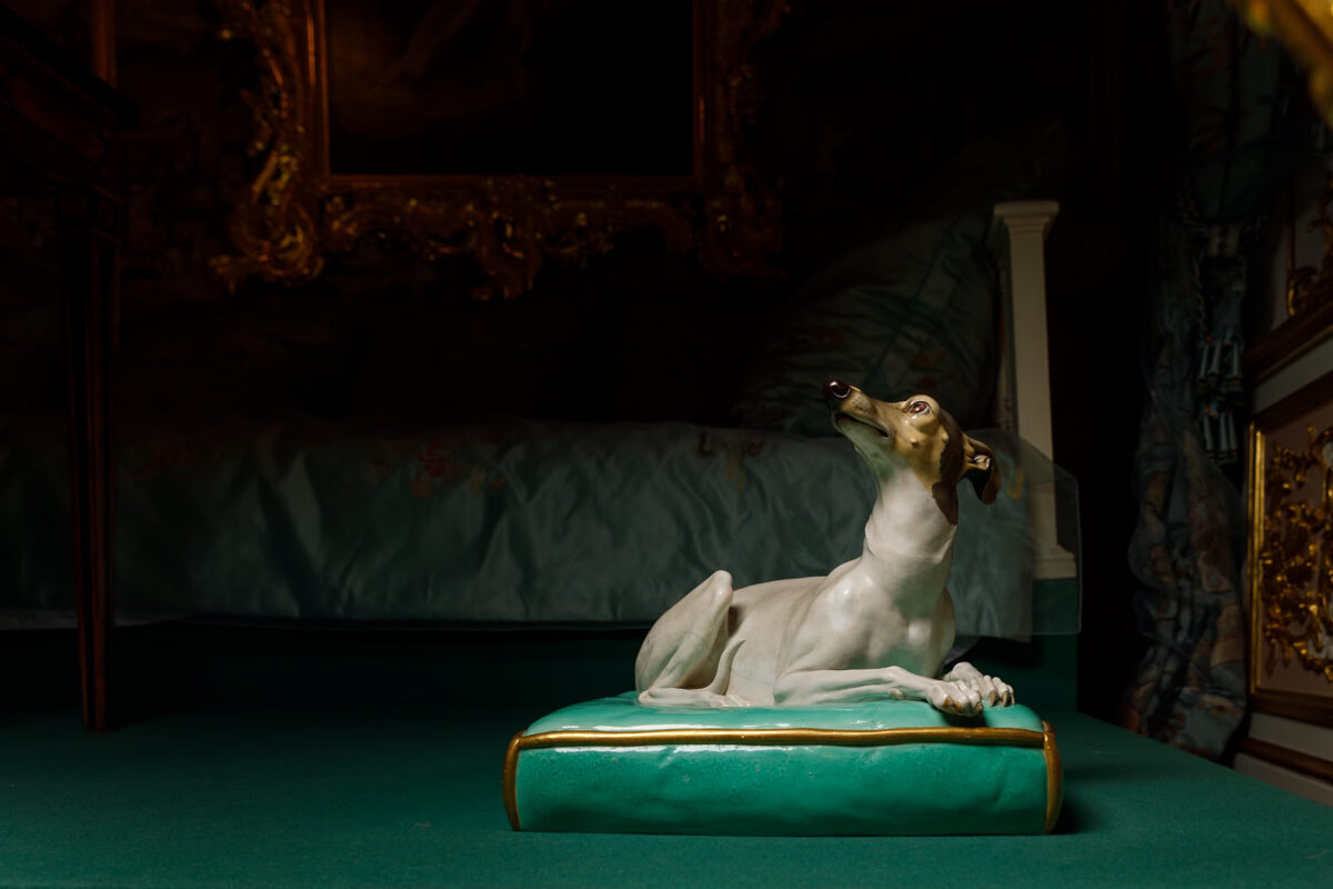 Любимую собаку Екатерины II звали Земира в честь героини популярной оперы «Земира и Азор». Избалованной левретке позволялось все — Екатерина II ее обожала. В одном из писем русская государыня писала: «Вы простите меня за то, что вся предыдущая страница очень дурно написана: я чрезвычайно стеснена в настоящую минуту некой молодой и прекрасной Земирой, которая...доводит свои претензии до того, что кладет лапы на мою бумагу». Пройдет время и на Императорском фарфоровом заводе по модели прославленного скульптора Жака-Доминика Рашетта будет изготовлена фигура прилегшей на подушку левретки Земиры. 🔍Ж.-Д. Рашетт Россия, Санкт-Петербург Императорский фарфоровый завод. 1780-1790-е годы Фарфор; роспись полихромная надглазурная, золочение 📍Большой петергофский дворец, Диванная #детали_петергофа