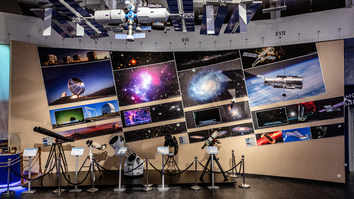 Астрономия — наука о Вселенной, изучающая небесные тела, звезды, планеты, кометы, астероиды, галактики и явления, происходящие в космосе. Эта область науки охватывает широкий спектр вопросов: от происхождения звезд и планет до эволюции галактик и самой Вселенной. Тысячи лет назад люди наблюдали за небом невооружённым глазом, фиксируя движение Солнца, Луны и звезд. В эпоху Возрождения развитие астрономии ускорилось благодаря изобретению телескопа Галилео Галилеем в XVII веке. Сегодня астрономы исследуют Вселенную с помощью мощных телескопов, приспособленных для улавливания электромагнитного излучения самого разного диапазона. В нижнем зале музея Урании на одной из стен находится тематическая экспозиция «Астрономия», на которой показаны современные астрономические исследования и достижения. Первая часть экспозиции знакомит посетителей с инструментами для наблюдений - орбитальными и наземными телескопами, обсерваториями. Среди них: космический телескоп «Хаббл», инфракрасный космический те