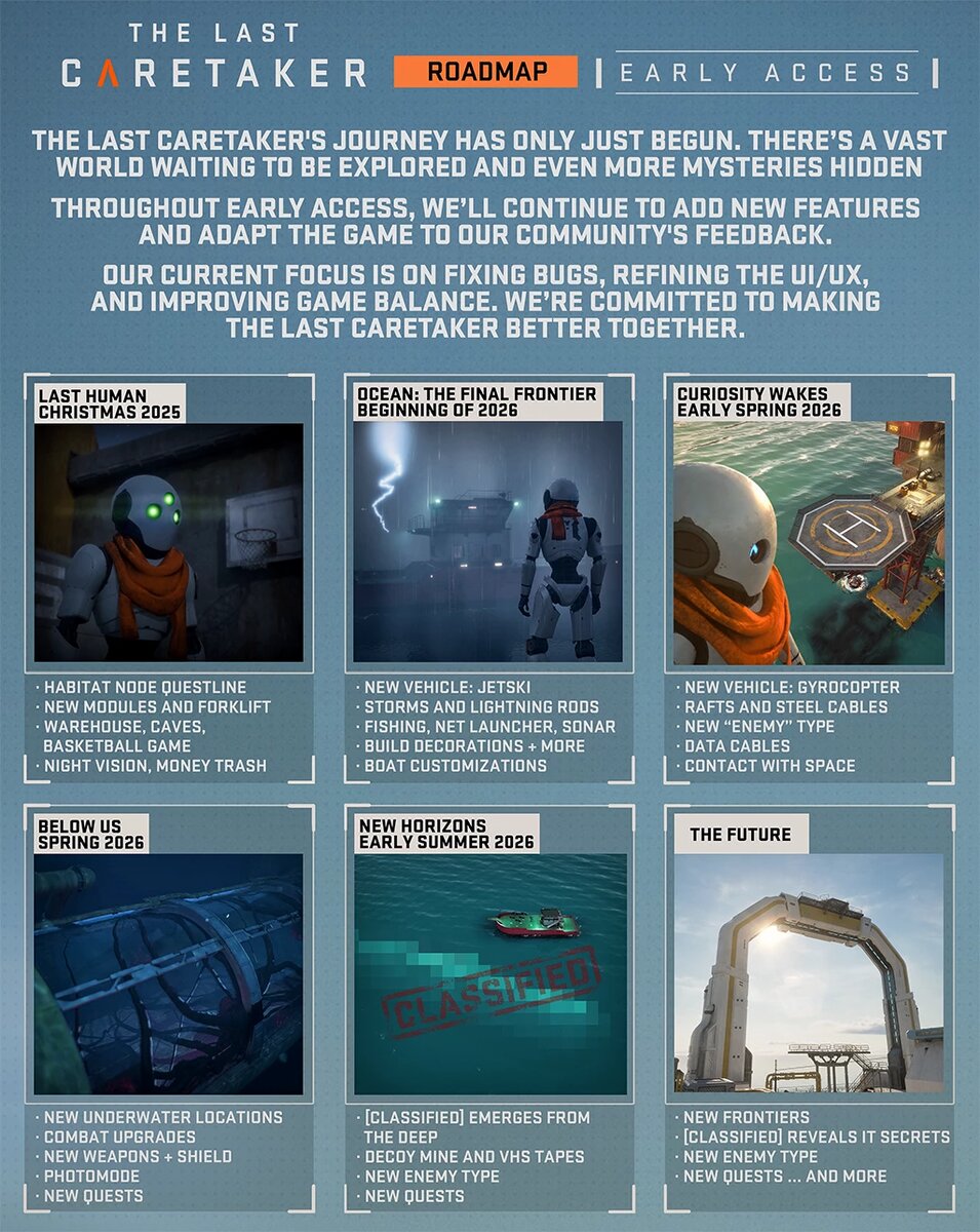 После четырёх лет разработки студия Channel37 выпустила игру The Last Caretaker в режим раннего доступа. Создатели с воодушевлением встретили этот этап, поблагодарив сообщество за поддержку и ценные отзывы, которые помогали на протяжении всего предрелизного периода. https://youtu.be/xZgDWk0xFNU Разработчики подчёркивают, что ранний доступ — лишь начало большого пути. Они приглашают игроков стать частью эволюции океанического мира, обещая постепенно наполнять его новыми транспортными средствами, предметами и игровыми системами. Для прозрачности процесса команда опубликовала подробную дорожную карту, где обозначены ключевые этапы предстоящего развития проекта. В игре пользователь берёт на себя роль последнего Смотрителя — возрождённой машины, от которой зависит судьба человечества. Действие разворачивается в мире, поглощённом океаном, где игроку предстоит восстанавливать системы, возрождать жизнь и готовить последний рывок к звёздам. Основные директивы чётко сформулированы: спасти челове
