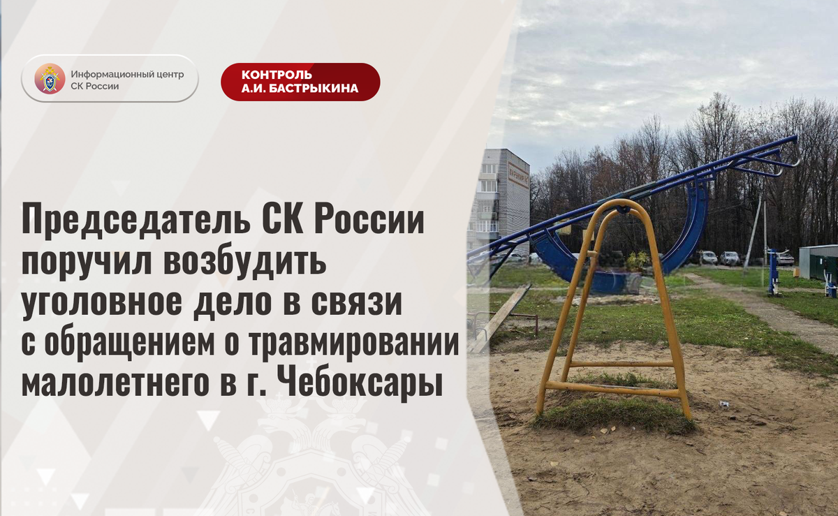 Председатель СК России поручил возбудить уголовное дело в связи с обращением о травмировании малолетнего в г. Чебоксары В СМИ сообщается об обращении жителей Чувашской Республики по вопросу травмирования их десятилетнего сына. В октябре текущего года на одной из детских площадок города Чебоксары мальчик во время катания на неисправных качелях упал и получил травмы. Пострадавшему потребовалась медицинская помощь. В СУ СК России по Чувашской Республики по данному факту организована процессуальная проверка. Председатель Следственного комитета Российской Федерации Александр Иванович Бастрыкин поручил руководителю СУ СК России по Чувашской Республике Александру Владимировичу Полтинину возбудить уголовное дело и представить доклад о предварительных и окончательных результатах его расследования. Исполнение поручения поставлено на контроль в центральном аппарате ведомства. #СледственныйКомитет #СКРоссии #СКР #ИЦСКР #ИнформационныйЦентр #АлександрБастрыкин #ПредседательСКР #КонтрольПредседателя
