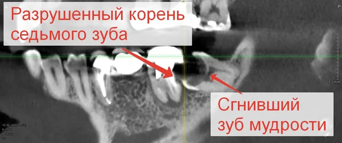 На снимке мы видим, как корень седьмого зуба гниет вслед за восьмеркой.