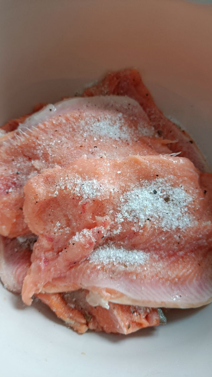 Поделюсь простым и проверенным рецептом засола горбуши сухим способом. Засолка горбуши сухим способом - популярный метод приготовления рыбного деликатеса, который позволяет сохранить натуральный вкус и текстуру рыбы. 🔹 Ингредиенты на 1 кг рыбы: - 2 столовые ложки крупной соли (40-50 г) - 1 столовая ложка сахара (20-25 г) - Несколько горошин черного и душистого перца (измельчить для аромата) 🔹 Приготовление: 1. Почистите рыбу и разрежьте по хребту. Можно филировать, убрать крупные кости. Хотя это можно будет сделать и после засолки. Бумажными полотенцами удаляем с рыбы лишнюю влагу. 2. Смешайте соль, сахар и дробленый перец. 3. Равномерно натрите рыбу подготовленной смесью. 4. Уложите в подходящую ёмкость и поставьте в холодильник. ⏳ Засолка занимает минимум 12 часов, но лучший вкус достигается через сутки. Более длительное хранение в рассоле может привести к излишней солености и плотности мяса. После засолки: - Слейте образовавшуюся после засолки рыбы жидкость. - Очистите рыбу от о