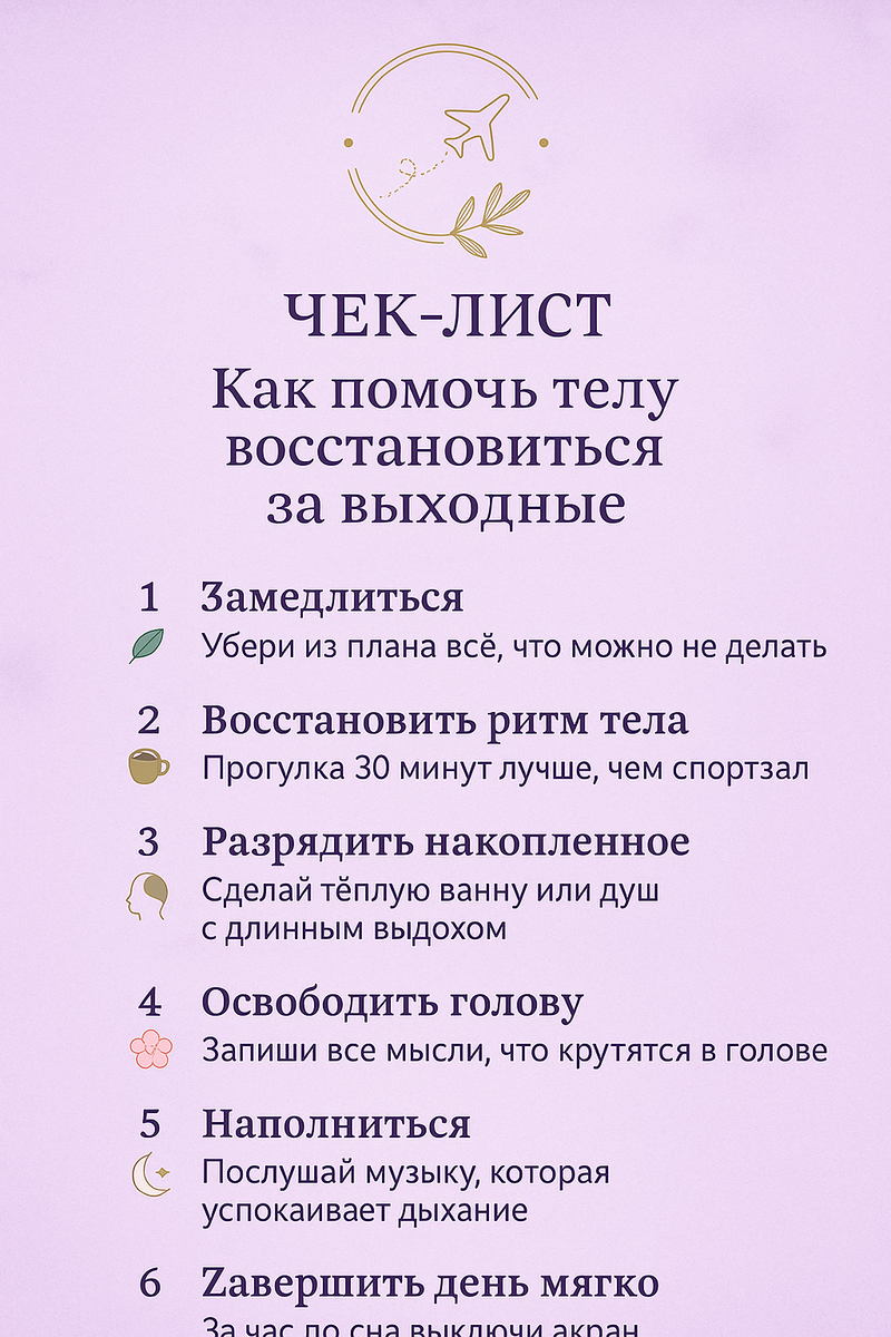 Формат: распечатай или сохрани в телефон, отмечай галочками Цель: снять внутреннее напряжение. Убери из плана всё, что можно не делать. Скажи себе: «Сегодня я ничего не должна». Отключи новости и рабочие чаты на минимум 6 часов. > Даже полдня без перегрузки мозга — уже перезагрузка нервной системы. Цель: вернуть телу чувство безопасности. Проснись без будильника, но встань не позже 09:30. Ешь каждые 3–4 часа, без гаджетов. Пей тёплую воду, избегай очень холодной. Прогулка 30 минут в спокойном темпе. > Тело любит предсказуемость. Когда ритм стабилен, тревога снижается. Цель: вывести стресс через тело. Тёплая ванна/душ + длинный выдох (вдох 4 — выдох 6–8). Мягкая растяжка: шея, плечи, грудной отдел. 5 минут лежать, отслеживая дыхание и пульс. > Движение тела запускает эмоциональную регуляцию. Цель:выключить внутреннего «контролёра». Выпиши всё, что крутится в голове. Раздели на два списка: «что в моей власти» и «что нет». Второй список зачеркни