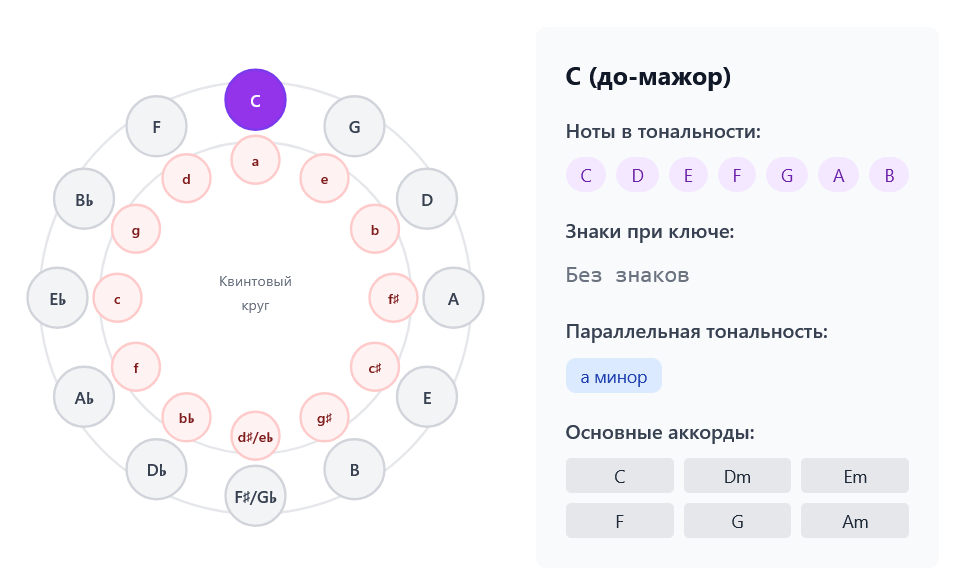 В центре квинтового круга находится тональность До мажор (C major) — она не содержит ключевых знаков (диезов или бемолей). Это наша точка отсчёта.