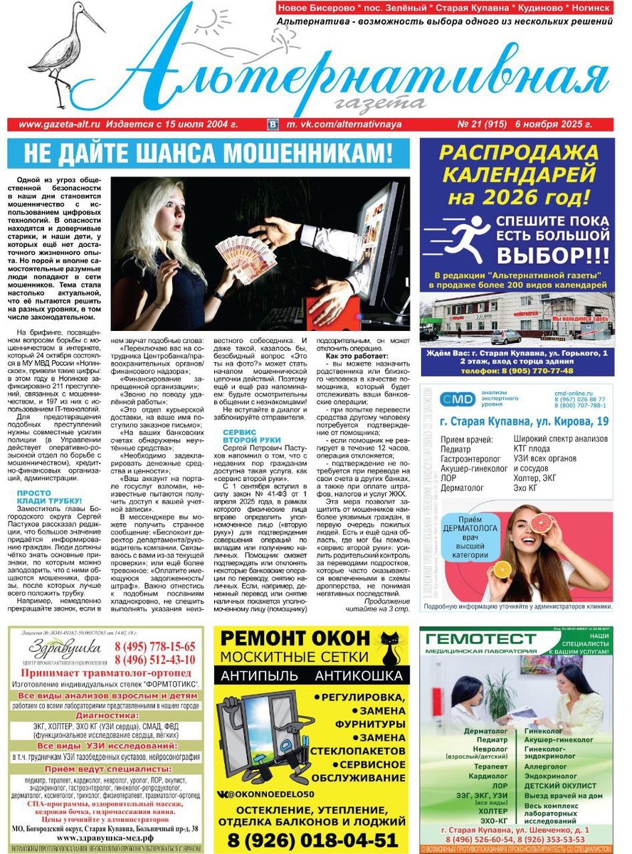 Вышел в свет свежий номер "Альтернативной газеты" Будьте в курсе того, чем живёт Старая Купавна и в целом Богородский округ! Небольшой восьмистраничный номер газеты, как всегда, насыщен материалами по актуальным темам, волнующим горожан и жителей округа. – Проблема мошенничества с использованием цифровых технологий в наши дни становится одной из угроз общественной безопасности. Рассказываем о том, как можно защитить себя и своих близких – новые возможности. – Начинается капитальный ремонт Центра культуры «Акрихин», которого так долго ждали горожане. Рассказываем, как будут работать творческие коллективы в период ремонта. – Закончив благоустройство, приведи в порядок территорию! К сожалению, не всегда строители придерживаются этого правила. Вместе с читателями боремся с недоделками. – Народная дружина ждёт новых бойцов. – Капремонт детского сада, высадка сирени в посёлке Зелёный и другие новости. – Гордимся нашими юными тяжелоатлетами. – Как передать показания электросчётчика, куда обр