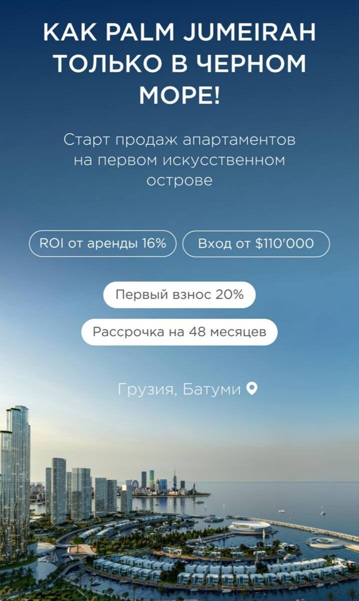 Апартамент ⚡️Батуми • мировой уровень Новый остров Планируемая доходность от управления вашим апартаментом от 13 до 19% Все номера с отделкой и встраиваемой мебелью. Минимальная площадь — ⚡️37 м2 от 111 559 $ - стоимость фиксируется в долларах Первоначальный взнос от 20% от 22 312 $ Рассрочка: 1й год 20% 2й год 25% 3й год 25% 4й год 10% Пример: По сегодняшнему курсу $ вход от 1 851 546 рублей (20%) При покупке нескольких лотов индивидуальные скидки При покупке с 50% взносом и рассрочкой на 48 месяцев скидка 5% При оплате 100% скидка 10% Больше подробностей , при встрече : пишите ⚡️@lyubovgorodilova ⚡️+79673158195 #грузия #батуми #остров #мировойуровень