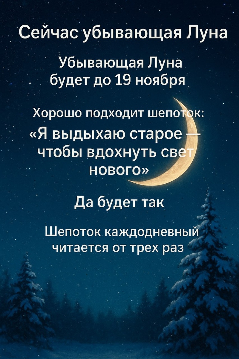 🌘 Сейчас убывающая Луна — и будет она до 19 ноября. Это время, когда лунный свет не просто гаснет — он забирает лишнее, смывает старые следы, стирает отпечатки того, что уже не нужно. Убывание — не потеря, это алхимия очищения. Всё, что мешает расти, само просится уйти. Это дни внутренней тишины, завершений и освобождений. 🔥 Отпустите обиды, старые обещания, усталость, то, что не несёт живого света. 🌬 И дайте место новому дыханию — свежему ветру перемен. ✨ Шепотковская практика от Ольги Шепоток✨ Девиз-шепоток: «Я выдыхаю старое — чтобы вдохнуть свет нового». 📜 Читать можно всю убывающую Луну — минимум три раза в день, в любое время. Главное — с чувством выдоха и лёгким поклоном Луне. При каждом повторе представляйте, как Луна забирает лишнее, а в сердце становится просторнее и светлее. 💫 Для усиления вихрей исполнения желаний: В комментариях напиши: 1. от чего ты хочешь избавиться; 2. что хочешь впустить или улучшить в своей жизни. Каждое слово в этот период убывания — э
