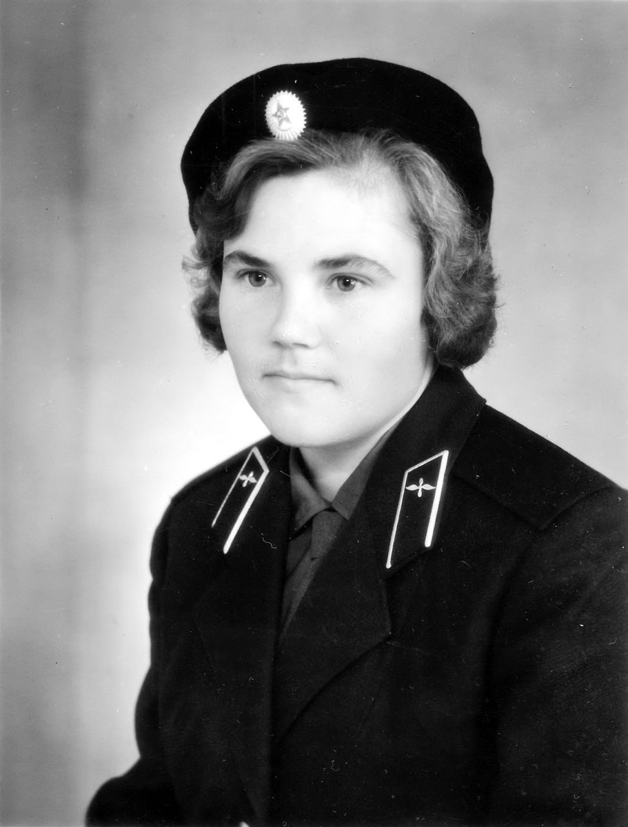 Девушка рядовая ВВС принятая на военную службу на должность солдат Советской армии в парадно-выходном мундире с нашивными суконными погонами