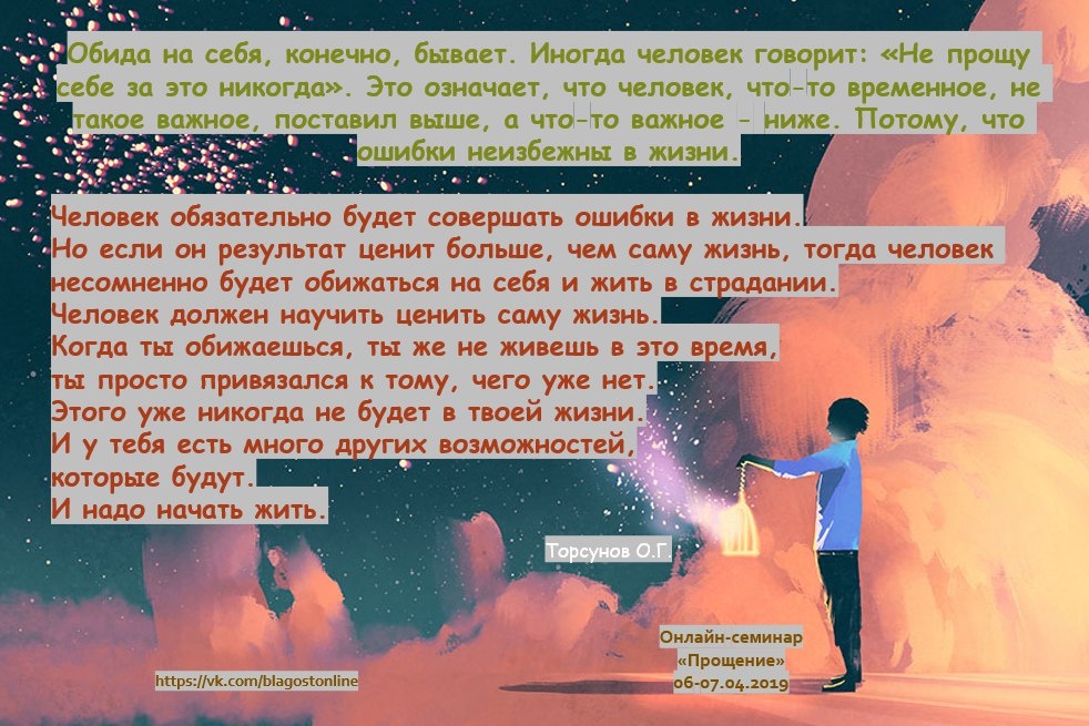 ОБИДА НА СЕБЯ, конечно, бывает. Иногда человек говорит: «Не прощу себе за это никогда». Это означает, что человек, что-то временное, не такое важное, поставил выше, а что-то важное - ниже. Потому, что ошибки неизбежны в жизни. Человек обязательно будет совершать ошибки в жизни. Но если он результат ценит больше, чем саму жизнь, тогда человек несомненно будет обижаться на себя и жить в страдании. Человек должен научить ценить саму жизнь. Когда ты обижаешься, ты же не живешь в это время, ты просто привязался к тому, чего уже нет. Этого уже никогда не будет в твоей жизни. И у тебя есть много других возможностей, которые будут. И надо начать жить.