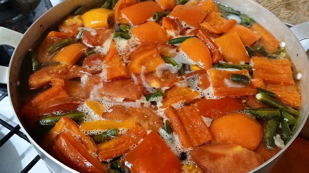 Готовится проще некуда: в крепкий бульон закидывается картошка и все прочие овощи, какие у себя найдёте. У меня это лук, морковь, стручковая фасоль, красный болгарский перец и помидоры. Перец и помидоры закидываю в самом конце, варю буквально пару минут и отключаю.