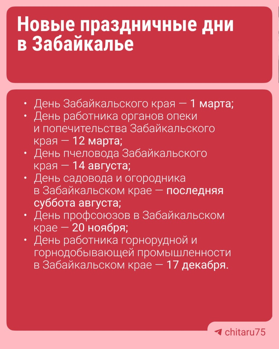 С днём пчеловода! Депутаты заксобрания Забайкалья утвердили список праздничных и памятных дат, которые будут отмечать в регионе. Власти объяснили, что это поможет сохранить уважение к истории, поддерживать духовные ценности и связь поколений. В праздники и памятные дни планируют проводить торжественные и культурные мероприятия. 🟦 Подписаться