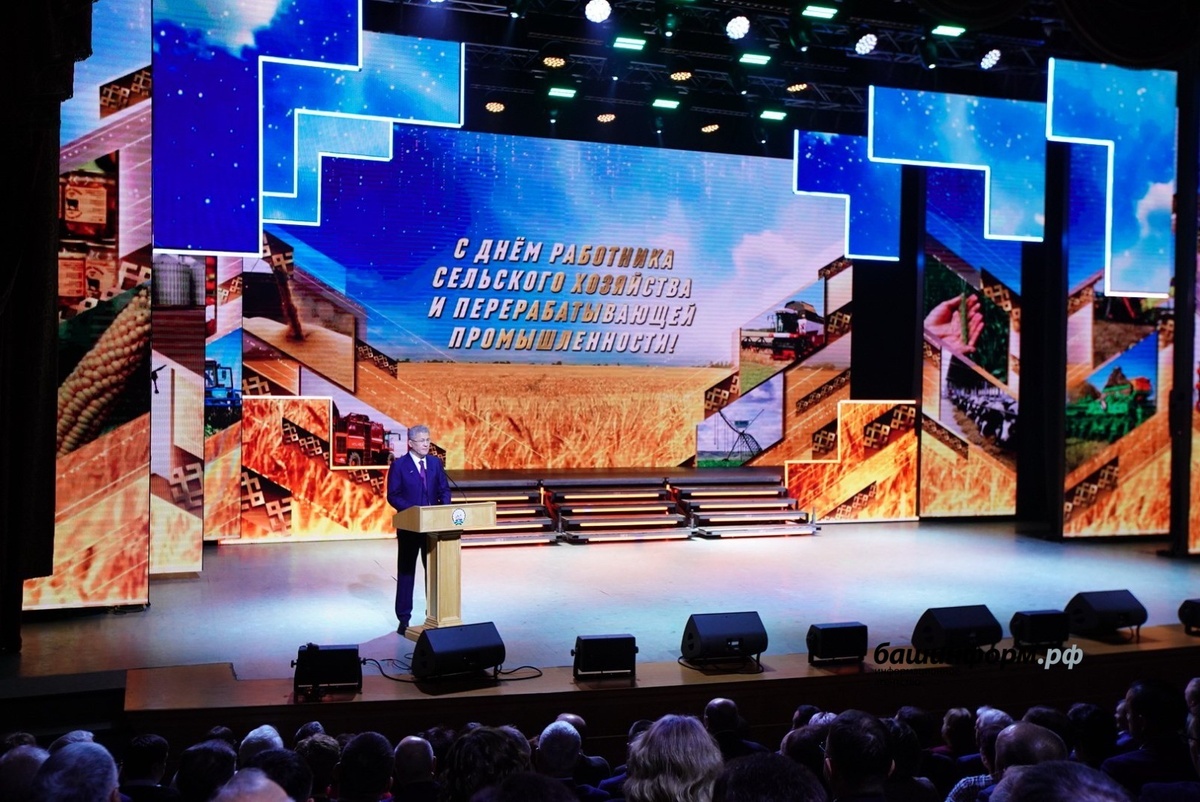 Глава Башкортостана Радий Хабиров поздравил аграриев республики с профессиональным праздником. От имени всех жителей республики он поблагодарил их за высокий профессионализм, ответственность, значительный вклад в обеспечение продовольственной безопасности республики и страны. На торжественном мероприятии, посвященном Дню работника сельского хозяйства и перерабатывающей промышленности, которое сегодня прошло в уфимском конгресс-холле «Торатау», Радий Хабиров отметил, что за 9 месяцев этого года объем произведённой сельхозпродукции вырос на 5,3%. Несмотря на все сложности, вновь выращен достойный урожай – более 3,8 млн тонн зерна, 2 млн тонн сахарной свеклы и впервые для нашей республики – около миллиона тонн масличных культур. Глава региона по традиции отметил тех, кто показал лучшие результаты. «Абсолютными лидерами по производству зерновых на протяжении нескольких лет остаются аграрии Стерлитамакского района, намолотившие более 250 тыс. тонн. Ещё 6 районов превысили отметку в 150 тыс.