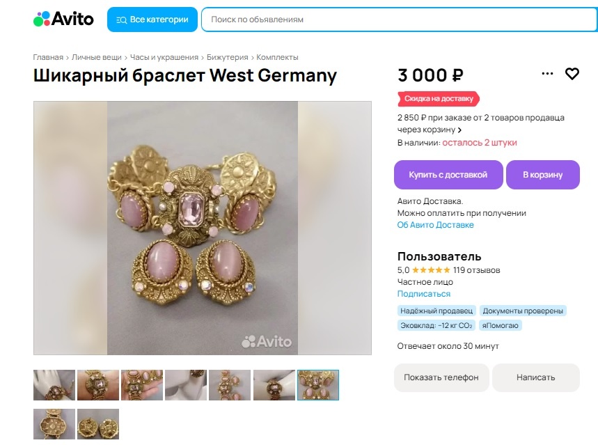 Эпизод 1 Браслет по дизайну знаменитого немецкого бренда West Germany. Инкрустация из натурального камня (Розовый опал), Австрийские кристаллы. Маркировка бренда осталось две штуки!!! Не очень понятное описание: по дизайну знаменитого бренда (???) и маркировка бренда. Начнем сначала. Никакого бренда West Germany (и одноименной компании тоже) не существовало. На территории Западной Германии были изготовлены украшения. Кто конкретно это делал? Не знает никто и уже не узнает. Да, действительно, есть маркировка. Как выглядят маркировки оригинальных украшений West Germany, можно увидеть в статье - "Ваша коллекция. Украшения West Germany. История. Маркировки. Разгадка одной загадки". Ссылка на нее есть внизу. И вот маркировка серег. Вот примеры оригинальных маркировок браслетов West Germany. Продается за 60$. Маркировка на застежке. Продается за 55$. Маркировка на застежке, но она уже другого типа. Маркировка на застежке клипсов Помним, что российский продавец давал информацию - осталось