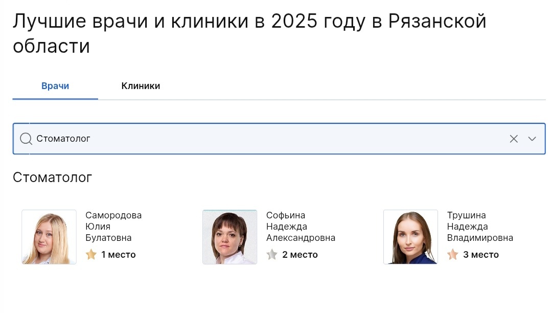 Ежегодно медицинский портал «ПроДокторов» присуждает награду лучшим врачам на основе отзывов пациентов. Премия вручается специалистам разных направлений, которые демонстрируют высокий уровень доверия и удовлетворённости среди пользователей платформы prodoctorov.ru — крупнейшего в России сервиса по поиску врачей и клиник. Миссия Премии: «Сделать медицину прозрачной и понятной для каждого». На днях были подведены итоги первого этапа премии, в рамках которого 8 врачей из сети клиник «Прайм-стоматология» вошли в номинацию «Топ-3 лучших врача в своей специальности» по Рязанской области. Победители определялись по рейтингу на основе реальных отзывов пациентов на платформе prodoctorov.ru. 🎈Поздравляем наших талантливых докторов и гордимся их успехами! И благодарим наших пациентов за высокий уровень доверия — это то, ради чего мы работаем❤. Ниже приводим данные по номинациям, в которых одержали победу врачи ПРАЙМа: 🏆 НОМИНАЦИЯ «СТОМАТОЛОГ» I место— Самородова Юлия Булатовна II место— Софьин