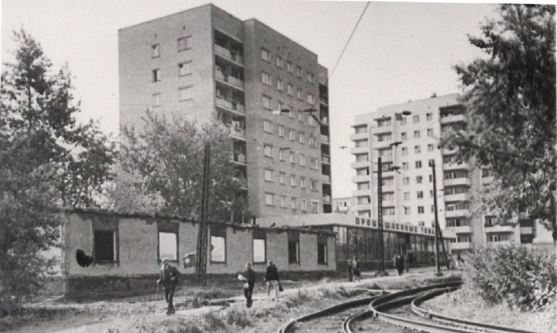 Свердловск. Разборка барака на трамвайном кольце «Эльмаш». 📸Снимок сделан в 1974–1975 годах. Видимая на фото наружная стена барака практически совпадает по линии с фасадом современного дома, возведённого на этом участке в переулке Черноморский, 2. Раньше вокруг кольца стояло множество аналогичных строений — оштукатуренных и побелённых бараков, которые использовались как жилые помещения до самого демонтажа.