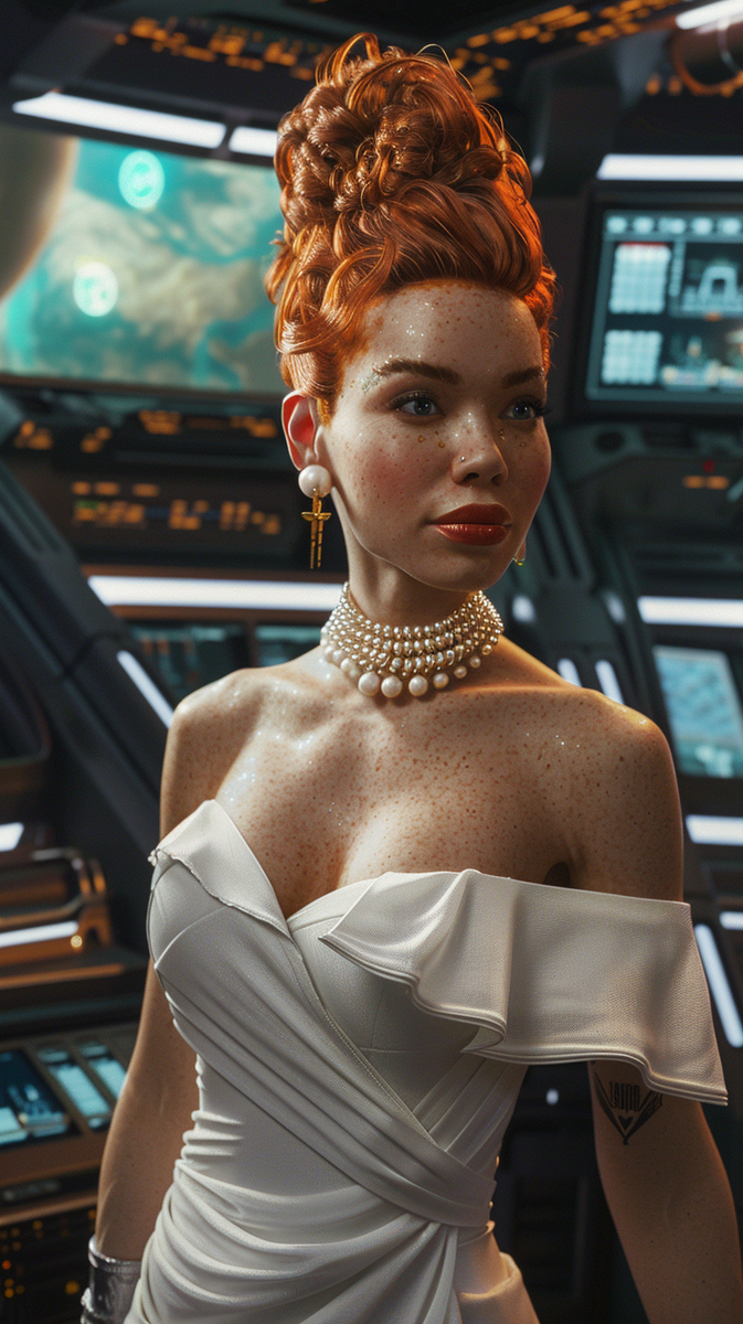 Мне хотелось показать контраст между классической элегантностью и холодной технологичностью — жемчуг и оборки на фоне сияющих панелей создают одновременно чувственность и власть. Делюсь промптом и результатом генерации, чтобы показать, как нейросеть воплотила эту идею. Промпт: A striking woman with vibrant red hair styled in a high bun stands in a futuristic control room. She wears a form-fitting, white, one-shoulder dress with a ruffled hem and neckline, adorned with a pearl necklace and a gold Starfleet-like insignia. The background features glowing screens and intricate machinery, suggesting a spaceship bridge or advanced technological setting. --ar 9:16 Понравились картины? Ставьте лайк, оставляйте комментарии и делитесь своими идеями для будущих шедевров!
