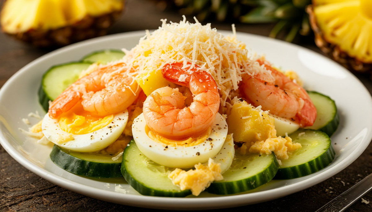 4. Деликатесная сердцевина. Выложите на ананасы целые, предварительно отваренные креветки. Их розовый цвет будет гармонировать с красной палитрой покровительницы года, а нежная текстура придаст салату особую изысканность. Не измельчайте креветки, чтобы сохранить их целостность и подчеркнуть щедрость угощения.