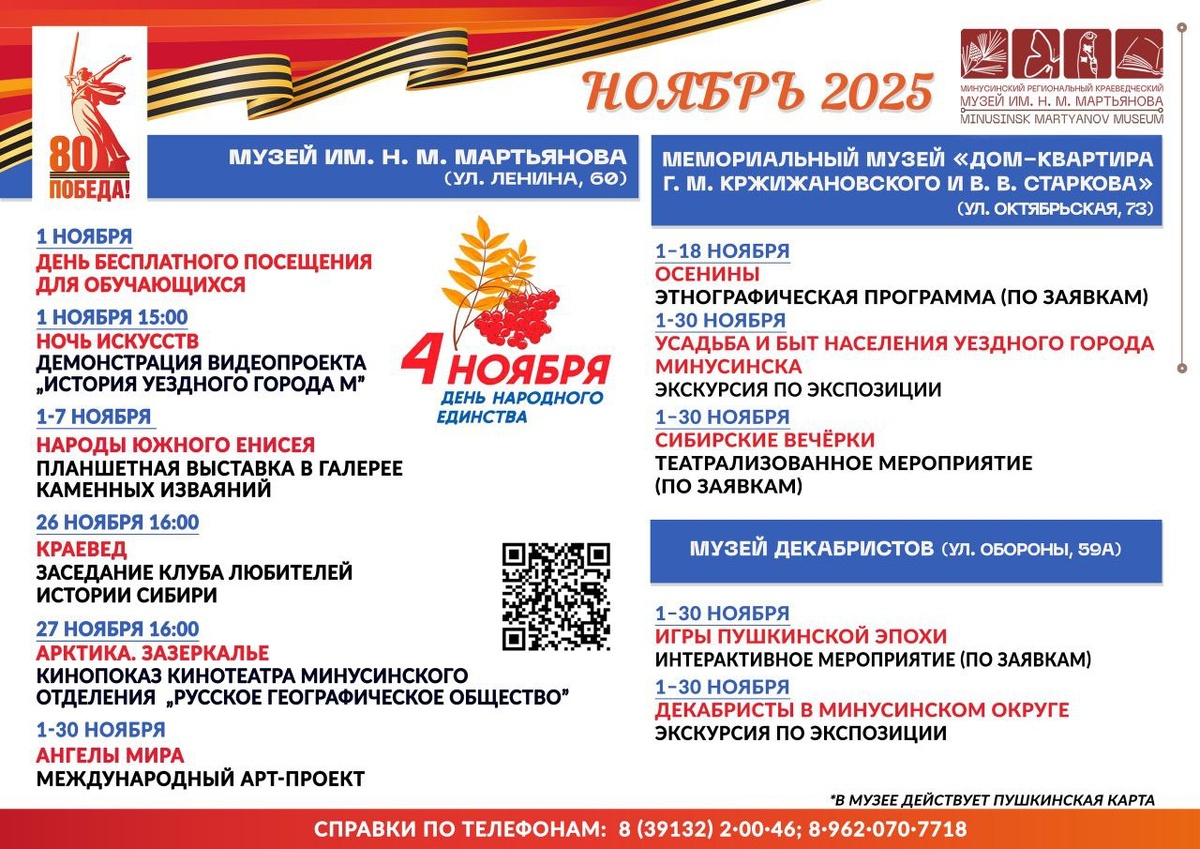 Афиша Минусинска: культурные и спортивные выходные 8-9 ноября Дорогие минусинцы и гости города! Предстоящие выходные, 8 и 9 ноября, обещают быть невероятно насыщенными. Проведите эти дни ярко и с пользой! 💥 ГЛАВНОЕ СОБЫТИЕ ВЫХОДНЫХ 💥💥💥 Торжественное открытие «умной» спортивной площадки * Дата: 8 ноября * Время: 12.30 * Место: Территория плавательного бассейна "ОКЕАНиЯ", ул. Трегубенко, 63Б. В программе для детей и взрослых: * спортивные локации: баскетбол, футбол, воркаут, площадка ГТО, сборка оружия; * подарки от краевого Центра спортивной подготовки для тех, кто пройдет испытания; * полевая кухня: угощаем всех гречневой кашей и горячим чаем! 🔸 МУЗЕИ И ВЫСТАВКИ Минусинский краеведческий музей им. Н.М. Мартьянова и его филиалы ждут гостей. * 8 ноября: с 10.00 до 19.00 * 9 ноября: с 10.00 до 18.00 Основное здание (ул. Ленина, 60) * Исторические экспозиции «Монументальное искусство...» и «Минусинский музей - первый на Енисее». * Выставки: «Случайные поступл