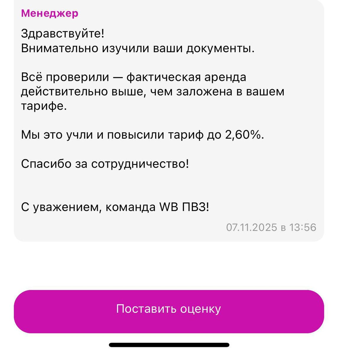 Делюсь кейсом, как нам снова повысили тариф на ПВЗ. Ранее нам подняли тариф на трех ПВЗ по инициативе ВБ, мы ничего для этого не делали. Мы решили попробовать и на других пунктах поднять и написали в поддержку, приложили договор аренды и все расходы на ПВЗ ежемесячные. Итог вы видите на скрине 🙌 Получилось!