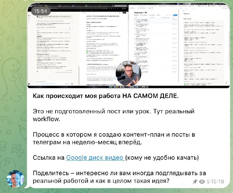 Насколько вам интересно подглядывать за рабочими процессами? В Аномалии гребенюка была такая практика, что предприниматели ходили друг к другу в гости. На экскурсию. Смотрели что как у кого происходит, работает, напитывались идей. Я вот в Фабрике эксперимента ради, да и интереса своего решил иногда записывать процессы создания контента. Своей работы по производству. А то промпты, готовые уроки и т.д. это конечно интересно. Но по факту реальное применение так и не понятно как... Часто методом тыка внедряешь. А тут наглядно. Как на практике это работает у конкретного человека с конкретными результатами.