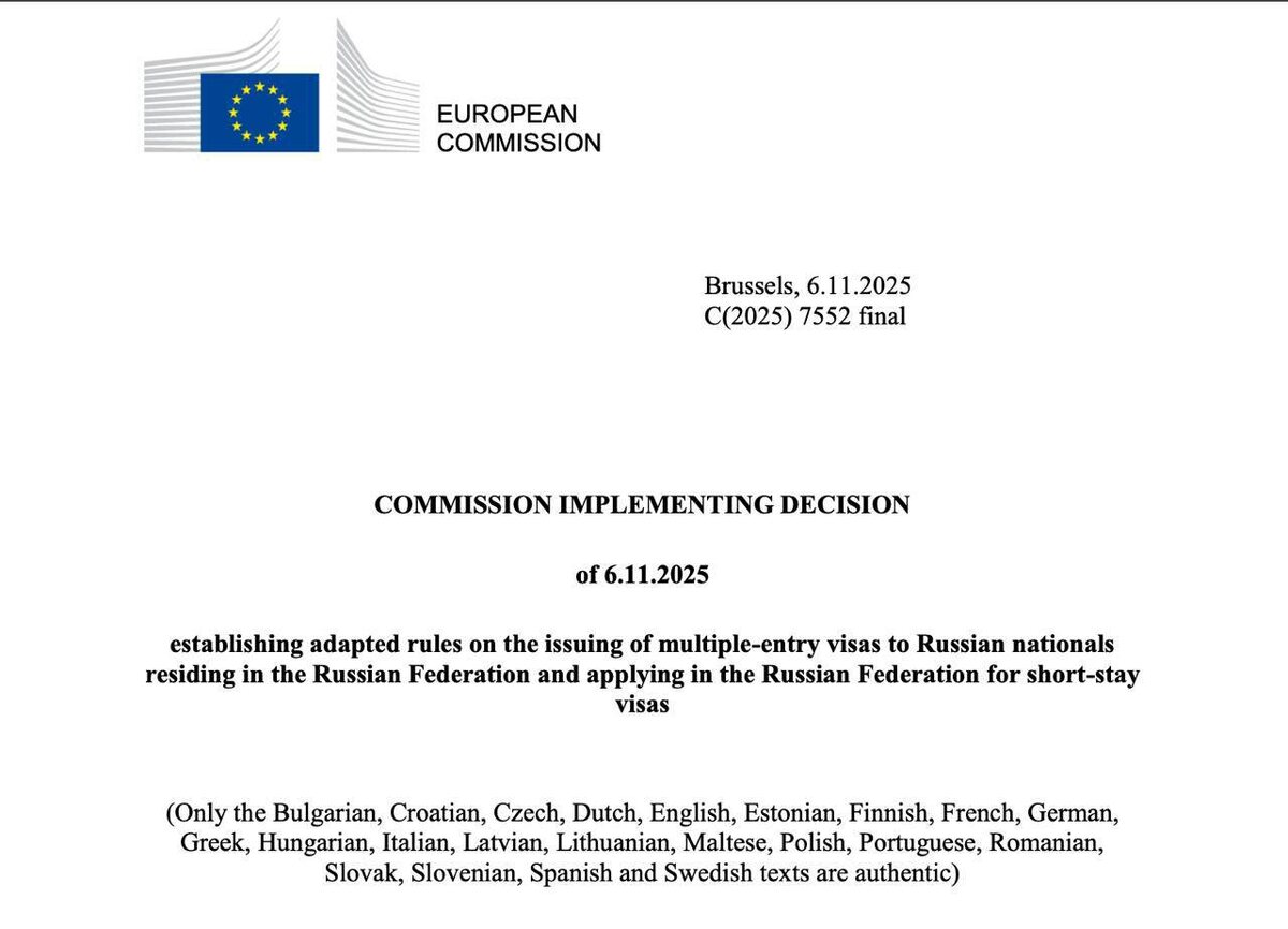 ⚡️ Еврокомиссия изменила правила выдачи мультивиз россиянам 6 ноября Еврокомиссия утвердила решение, которое вносит изменения в порядок выдачи многократных виз гражданам России. Документ вступит в силу 7 ноября 2025 года и касается новых заявлений, поданных в консульствах стран ЕС на территории России. 📄 Кому по-прежнему доступны мультивизы: – близким родственникам граждан или резидентов ЕС (при наличии визовой истории) – транспортным работникам – морякам, водителям, членам экипажей поездов и автобусов (при условии, что за последние два года визы использовались без нарушений) Срок действия: – до 1 года – для родственников; – до 9 месяцев – для транспортников. Для остальных категорий граждан визы будут преимущественно однократными. ❗️ Важно: все ранее выданные многократные шенгенские визы остаются действительными. Новые правила не аннулируют уже оформленные документы и не ограничивают возможность подачи на визу в целом. Представитель Еврокомиссии Маркус Ламмерт подчеркнул, что р