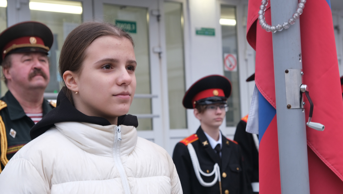 Право поднять Государственный флаг Российской Федерации на этой неделе представилось ученице 7 «К» Екатерине и ученику 5 «Д» Кириллу