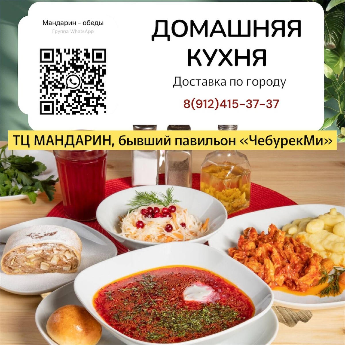 🍽 Вкусная домашняя еда в ТЦ «Мандарин» Приглашаем вас в уютное кафе, расположенное на территории возле ТЦ «Мандарин» (бывший павильон «ЧебурекМи»). Для вас ежедневно и с душой готовят: 🥘 Первые и вторые блюда; 🥗 Свежие салаты; 🍢 Закуски; 🥐Ароматная выпечка; 🚗 Доставка по городу в удобное для вас время! Присоединяйтесь к нашей группе в WhatsApp — ежедневно публикуем актуальное меню и специальные предложения! ▶️Посмотреть меню◀️ 📞 Для заказа и подробностей звоните: 8(912)415-37-37 Ждем вас за вкусным домашним обедом! 🍽