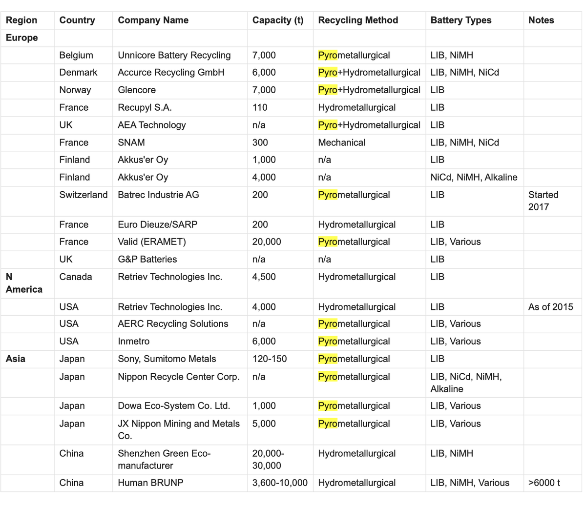 В данной таблице, которую я позаимствовал, показаны промышленные объекты, перерабатывающие аккумуляторы. Если приглядеться, (я вам подсветил желтеньким) то можно увидеть долю пирометаллургического метода, который используется в переработке во всем мире. И шок контент - его правда очень много.