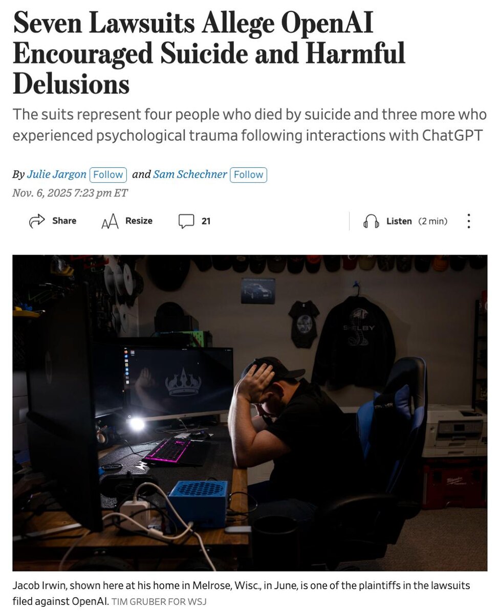 А вот и первые дела подъезжают. ChatGPT обвиняют в подстрекательстве к суициду. Семьи из США и Канады подали семь исков против OpenAI. Из заявлений понятно, что после общения с ChatGPT с собой покончили четыре человека. Ещё трое получили сильную психологическую травму. Требования понятные — компенсация и проведение корректировки ИИ. OpenAI уже разбирается в деталях. Тут интересно, что, возможно, это вполне могут быть обычные ушлые люди, которые ищут на кого возложить смерть человека, но факт есть факт: после общения с чат-ботом уже были зафиксированы и случаи самоубийства, и случаи подстрекательства к убийству, так что проблема есть. И если слово этого года по многим причинам — «ИИ-слоп», то очень вероятно, что в следующем году мы столкнёмся с массовым «ИИ-психозом». @lobushkin