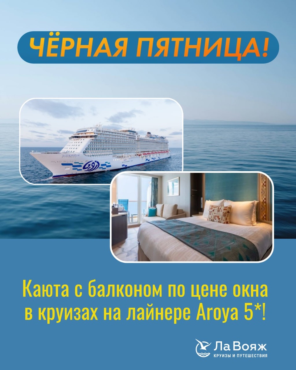 “Черная Пятница” от Aroya Cruises: повышаем градус категорию каюты! 🚢 Супер предложение: каюта с балконом по цене каюты с окном на всех круизах Aroya 5*! Забронируйте до 2 декабря круиз в каюте с балконом и наслаждайтесь путешествием с максимальным комфортом. 📅 Сроки акции: 07.11.2025 - 02.12.2025 🎯 Важные детали: - Действует на новые бронирования, созданные в период действия акции. - Участвуют круизы с отправлением после 9 ноября 2025 г. - Каюты категории Balcony Superior в акции не участвуют. - Специальные скидки для детей до 12 лет при размещении на 3-м, 4-м и 5-м месте (учтены в стоимости) ‼️ Не упустите шанс путешествовать с комфортом премиум-класса по выгодной цене! Это ваш звездный час для круиза на лайнере Aroya 5*. ➡️ Узнать подробности и выбрать маршрут ❓Есть вопросы – пишите в наш чат