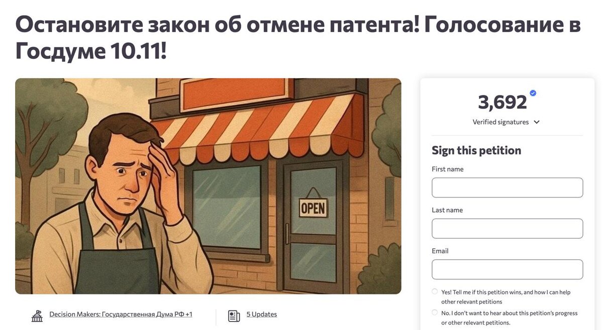 Активные предприниматели сферы торговли создали петицию. Поделились в комментариях, выношу её сюда: Петиция о том, чтоб не отменяли патент для торговли и грузоперевозок и сделали переходный период: https://c.org/rd6PHLMgW9