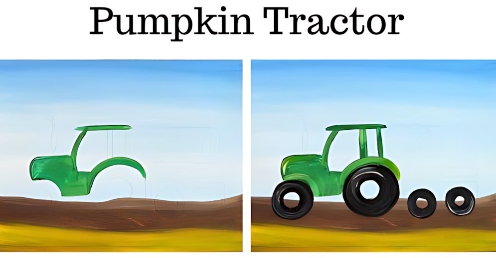 ТРАКТОР С ТЫКВАМИ Сегодня мы приглашаем вас в увлекательное творческое путешествие и научим создавать яркий осенний рисунок – трактор с тыквами. Искусство создания осеннего шедевра: как нарисовать яркий осенний пейзаж с зелёным трактором и прицепом, полным сочных тыкв, используя гуашевые краски. Пошаговое руководство по созданию живописного образа, наполненного осенними красками и богатым урожаем, станет источником вдохновения для всех, кто любит творить. Шаг 1: Фон сделайте зелёным, чтобы имитировать поля, а небо – голубым. Начните с простого построения трактора, чтобы нарисовать основу трактора. Обозначьте колёса, кабину и прицеп. Шаг 2: Создайте объёмный образ. Колёса закрасьте чёрной краской, а металлические элементы добавьте серым оттенком. Шаг 3: Кузов сделайте ярко-зеленым, добавив сверху оранжевый цвет для эффекта солнечного света. Завершите рисунок белыми световыми бликами. Шаг 4: Переходите к тыквам. Заполните багажник яркими оранжево-красными кругами. Прожилки подчеркните